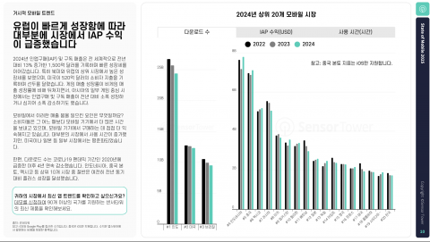 ¸ð¹ÙÀÏ °ÔÀÓÀ» Á¦¿ÜÇÑ ¸ð¹ÙÀÏ¿¡¼ÀÇ IAP ¼öÀÍÀº Áö³ 10³â µ¿¾È ±ÞÁõÇØ 2014³â 35¾ï´Þ·¯¿¡¼ 2024³â 690¾ï´Þ·¯ ÀÌ»óÀ¸·Î Áõ°¡Çß´Ù. ÀÌ·¯ÇÑ ¼ºÀåÀº Á¡Á¡ ´õ °¡¼Óȵǰí ÀÖÀ¸¸ç, 2024³â ÇÑ ÇØ¿¡¸¸ ¾Û¿¡¼ ¾à 140¾ï´Þ·¯ÀÇ Ãß°¡ Àξ۱¸¸Å ¼öÀÍÀ» ¿Ã·Á 2023³â¿¡ ±â·ÏÇÑ 90¾ï´Þ·¯¸¦ Å©°Ô »óȸÇß´Ù. °ÔÀÓ ºÎ¹®Àº 2024³â¿¡µµ 800¾ï´Þ·¯¸¦ µ¹ÆÄÇÏ¸ç ¿©ÀüÈ÷ ¸ð¹ÙÀÏ ÁöÃâÀÇ ´ëºÎºÐÀ» Â÷ÁöÇß´Ù.