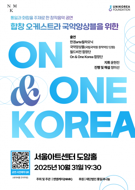 NMK°¡ ÁÖÃÖÇϰí Àç´Ü¹ýÀÎ ÅëÀϰú³ª´®ÀÌ ÈÄ¿øÇϴ âÀÛÀ½¾Ç °ø¿¬ ¡®On & One Korea¡¯°¡ ¿À´Â 10¿ù 31ÀÏ(±Ý) ¿ÀÈÄ 7½Ã 30ºÐ ¼¿ï¾ÆÆ®¼¾ÅÍ µµ¾ÏȦ¿¡¼ ¿¸°´Ù.
